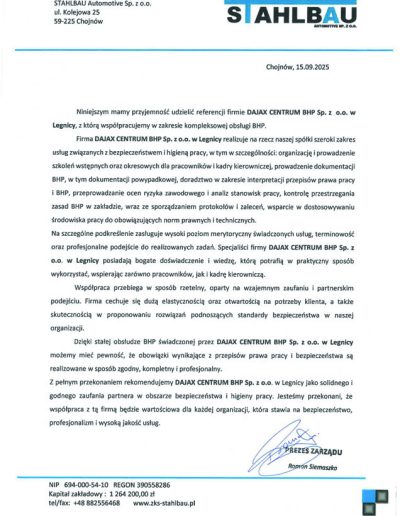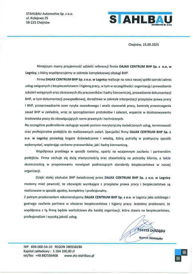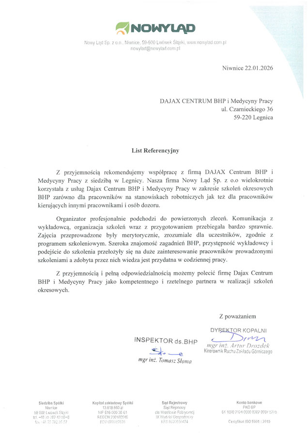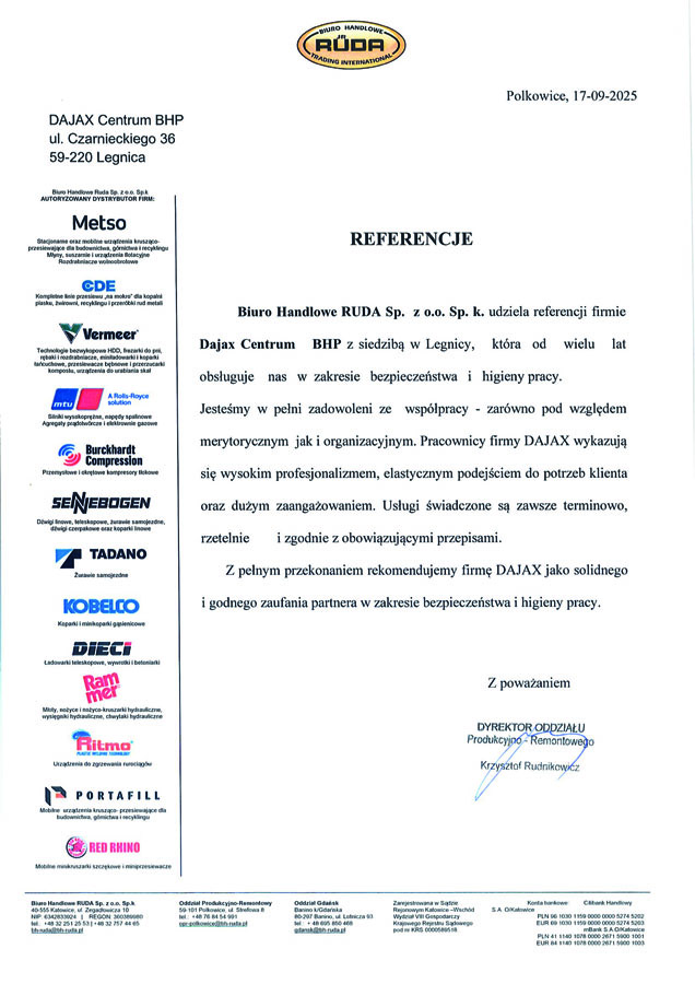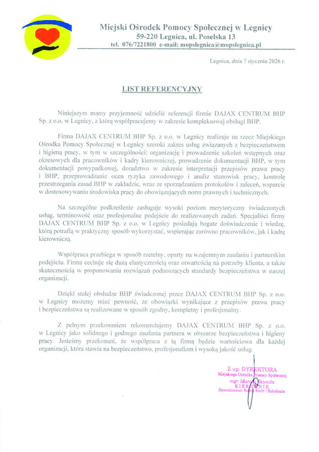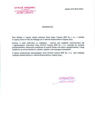 DAJAX Centrum BHP od 1990 roku wspiera firmy w całej Polsce, oferując kompleksowe usługi z zakresu BHP, PPOŻ., ochrony środowiska oraz medycyny pracy. Doświadczenie, sprawdzone procedury i wykwalifikowany zespół to gwarancja zgodności z przepisami i realnego wsparcia na co dzień.